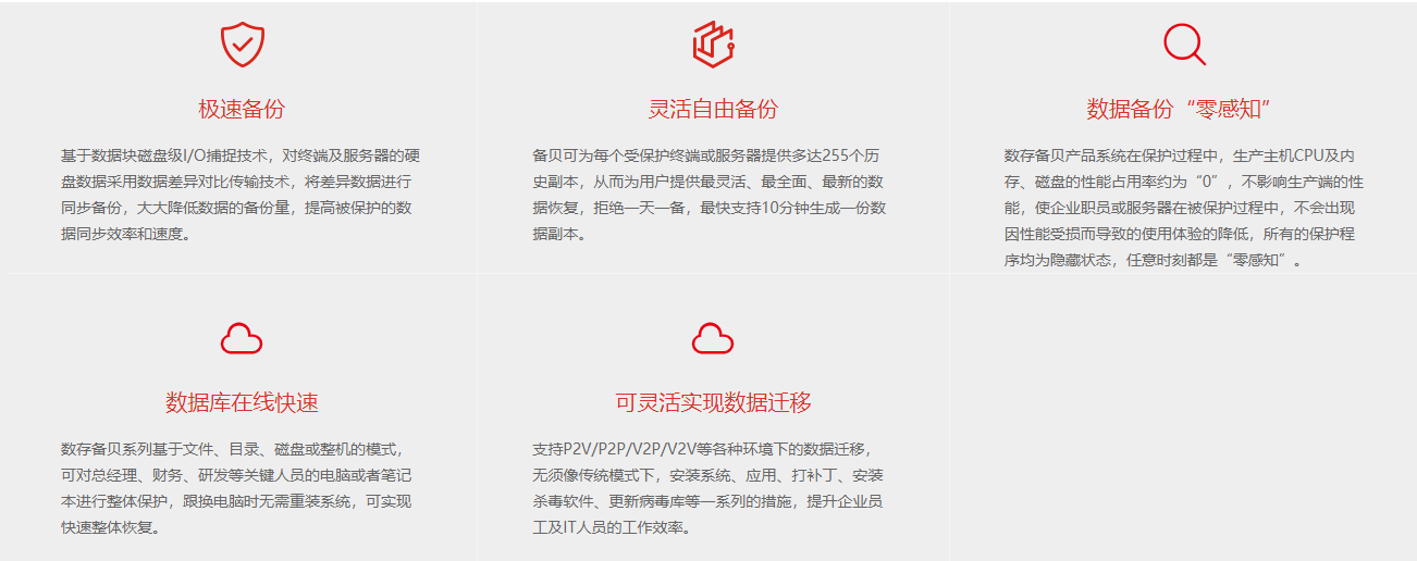 数存备贝系列是针对中小型企业而设计的基于磁盘级别的快速容灾备份产品。提供了全面的信息化安全防护能力,具备高速的信息化传输速度、不影响被保护的终端及服务器、出现任意的软件、硬件故障及数据丢失时,可以快速的找回数据或恢复应用等,从而实现最快速、最极致的企业信息化安全保护方案。