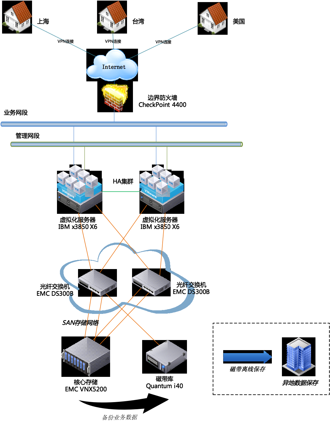 三、配置两台EMC DS300B SAN交换机组成光纤SAN(FC SAN)存储网络,配置一台EMC VNX5200中端存储阵列做为虚拟化存储平台,及数据中心的集中共享存储平台。同时配置一台昆腾i40磁带库接入光纤SAN存储网络,做为数据备份设备。