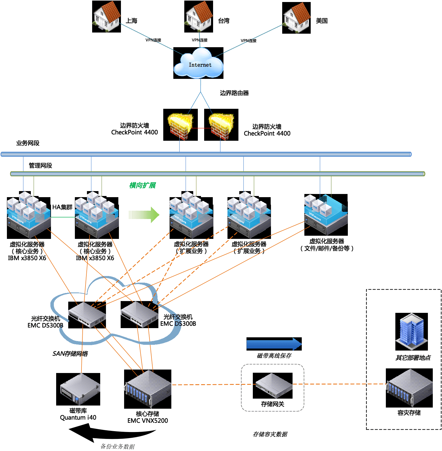 本方案的系统基础架构采用VMware虚拟化设计方案 + SAN存储设计方案: