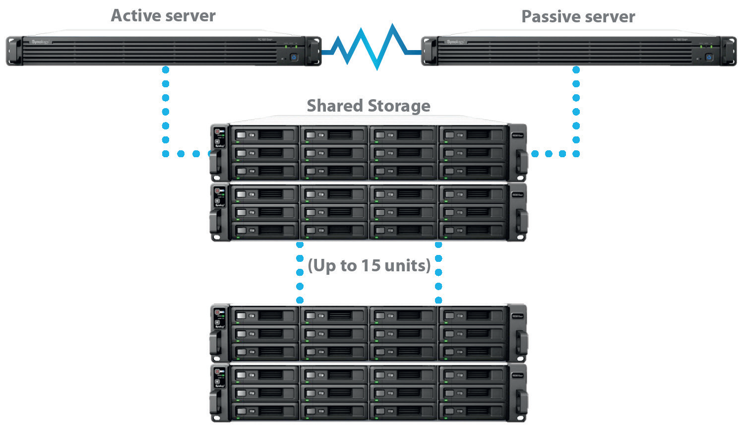 Synology high-availability (HA) 集群解决方案旨在通过将两台 RackStation RC18015xs+ 和多台扩充设备 RXD1215sas 整合为一个 HA 集群来缓解这一问题。