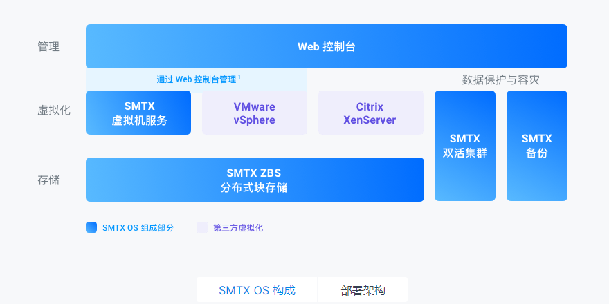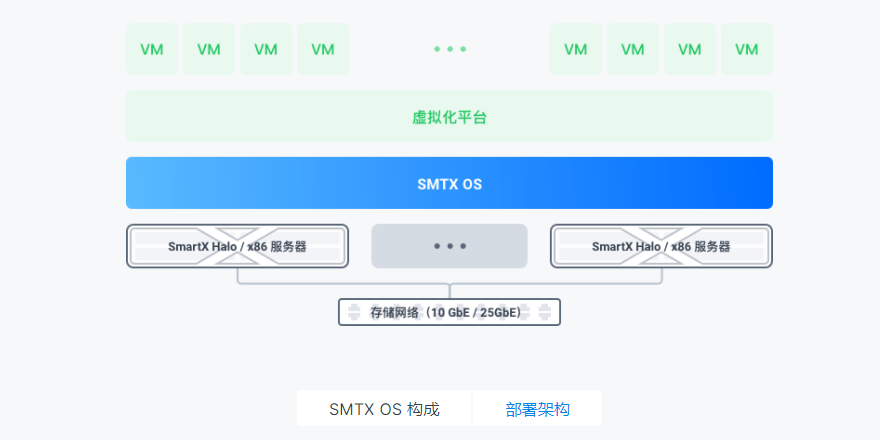 SMTX OS 超融合软件内建免费的虚拟机服务,结合由 SmartX 自主研发的块存储服务,提供化繁为简的新一代 IT 基础架构。