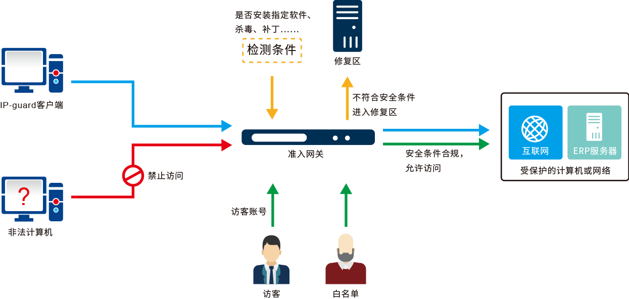 计算机接入企业内部网络对服务器、互联网等访问时,需要经过准入网关严格的审核,只有合法的计算机才能连入访问,非法计算机可根据需要将其引导至隔离区进行修复,或者完全阻断其访问。